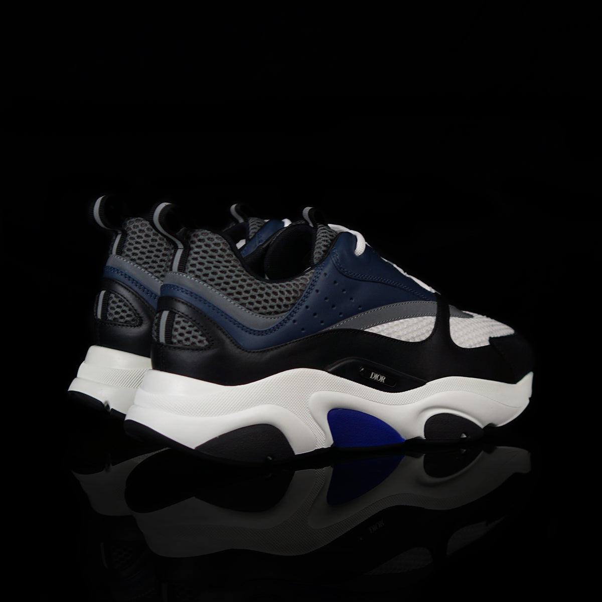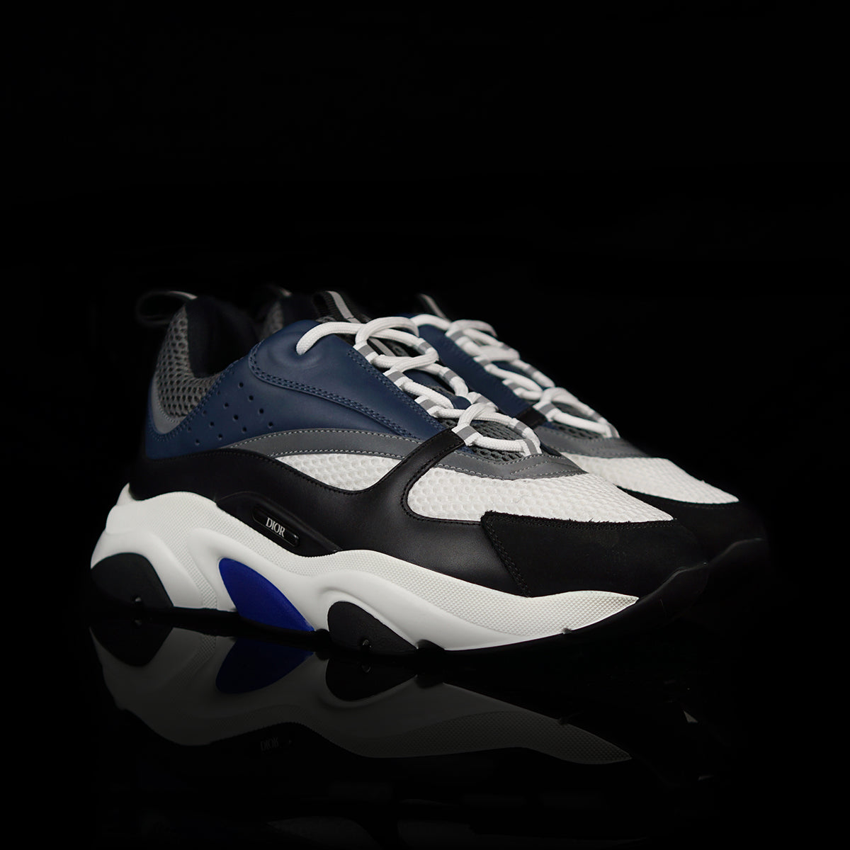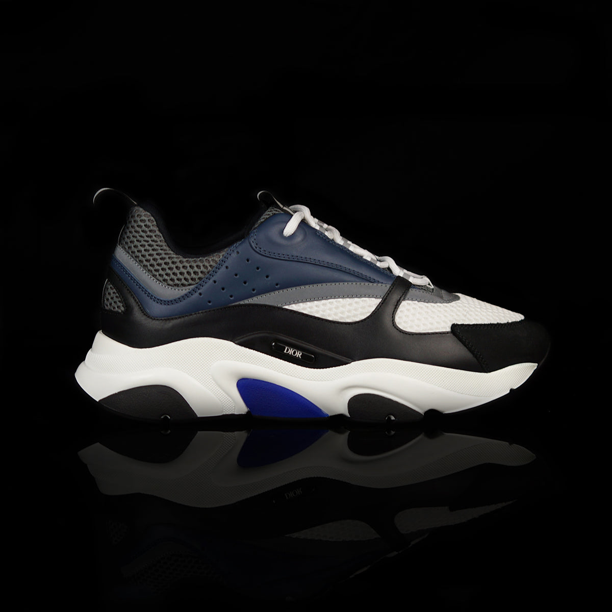 The B22 sneakers from Dior Homme blend sporty style with luxury design, featuring white technical knit and blue calfskin, black nylon lining, and a black rubber sole embossed with the “Dior Homme” logo. They offer a modern, bold aesthetic, completed with white cotton laces and a sleek black pull tab for easy wear. These high-end sneakers are crafted using a "welded" construction, making them both durable and fashion-forward.