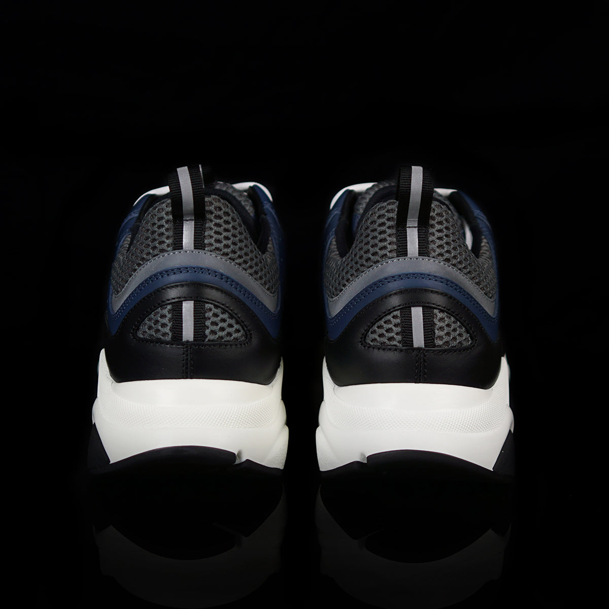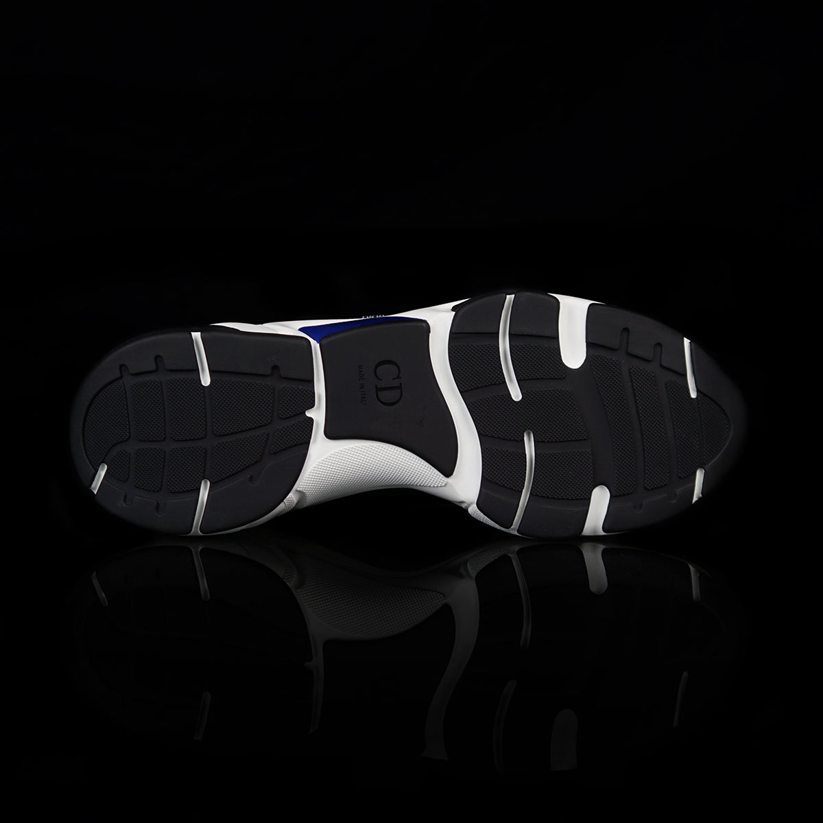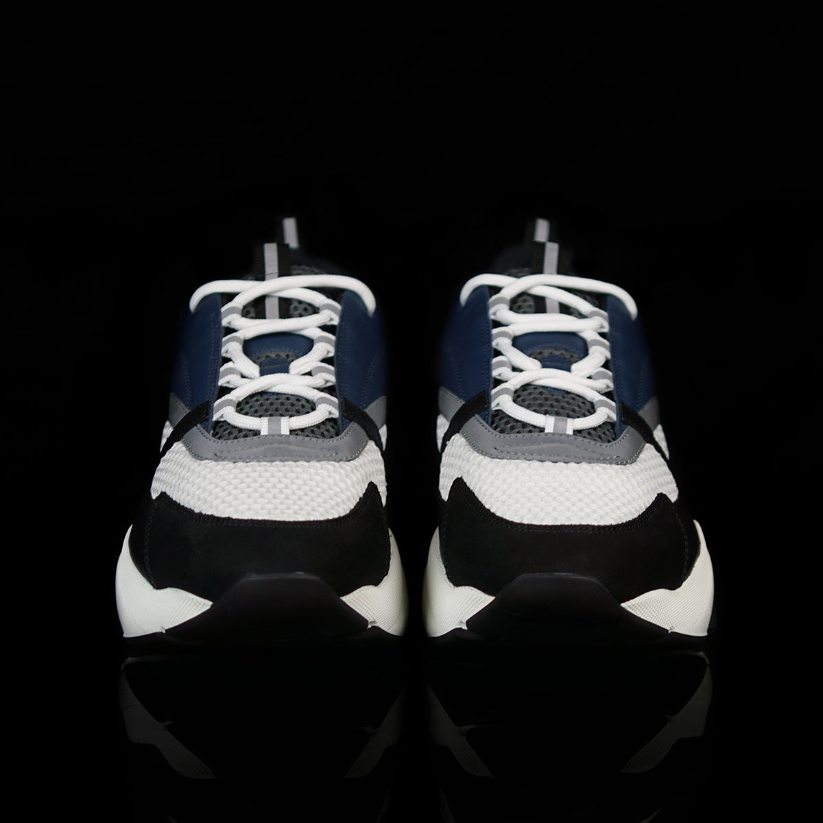 The B22 sneakers from Dior Homme blend sporty style with luxury design, featuring white technical knit and blue calfskin, black nylon lining, and a black rubber sole embossed with the “Dior Homme” logo. They offer a modern, bold aesthetic, completed with white cotton laces and a sleek black pull tab for easy wear. These high-end sneakers are crafted using a "welded" construction, making them both durable and fashion-forward.