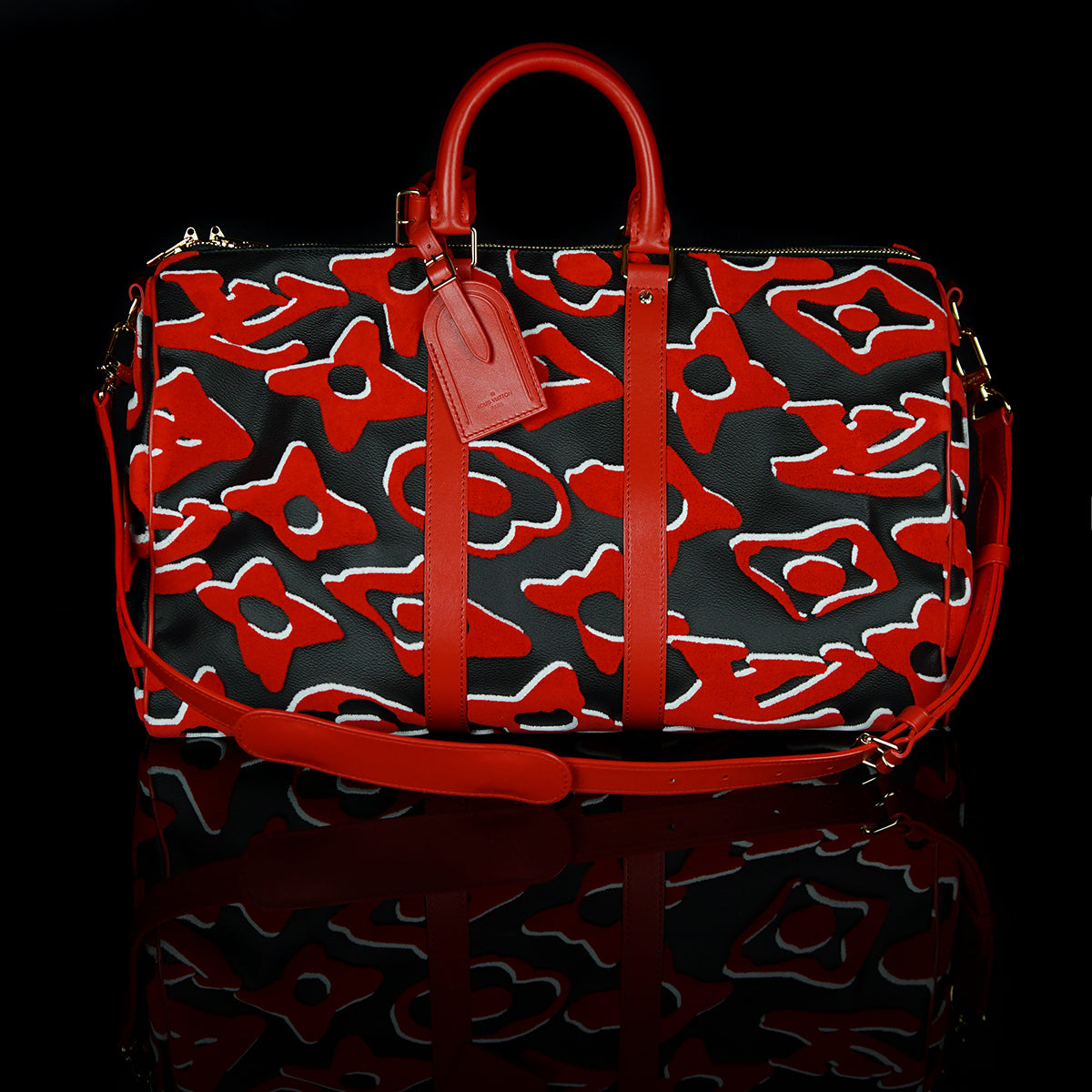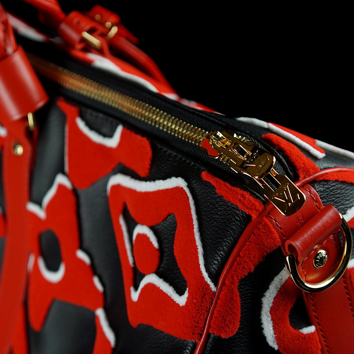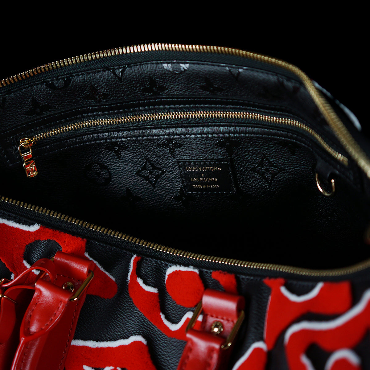 This bold version of the Bandoulière 45 Keepall bag is part of the special edition of seven bags proposed in the LV x UF Collection. The iconic weekender gets an arty vibe from the red and black Monogram motif, refashioned by Swiss artist Urs Fischer. The velvety, raised pattern gives the bag a unique tactile appeal. Collectors, take note.