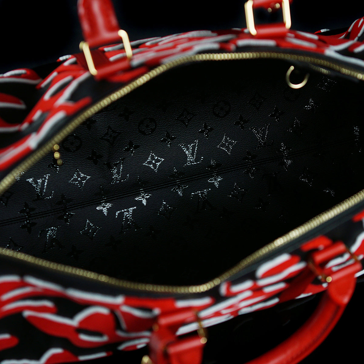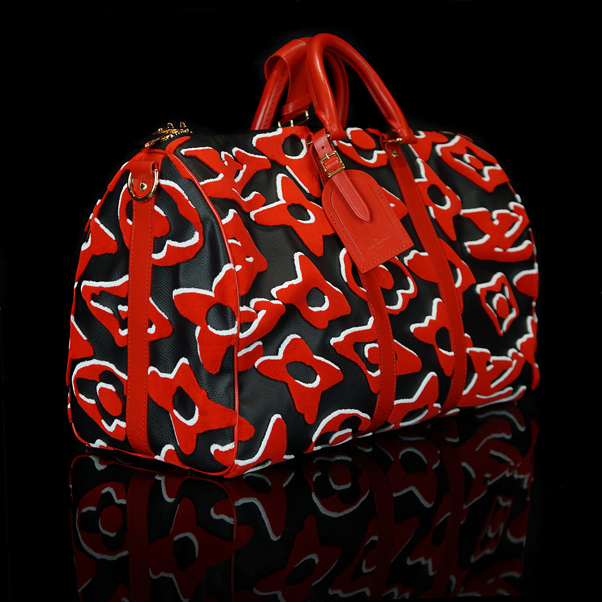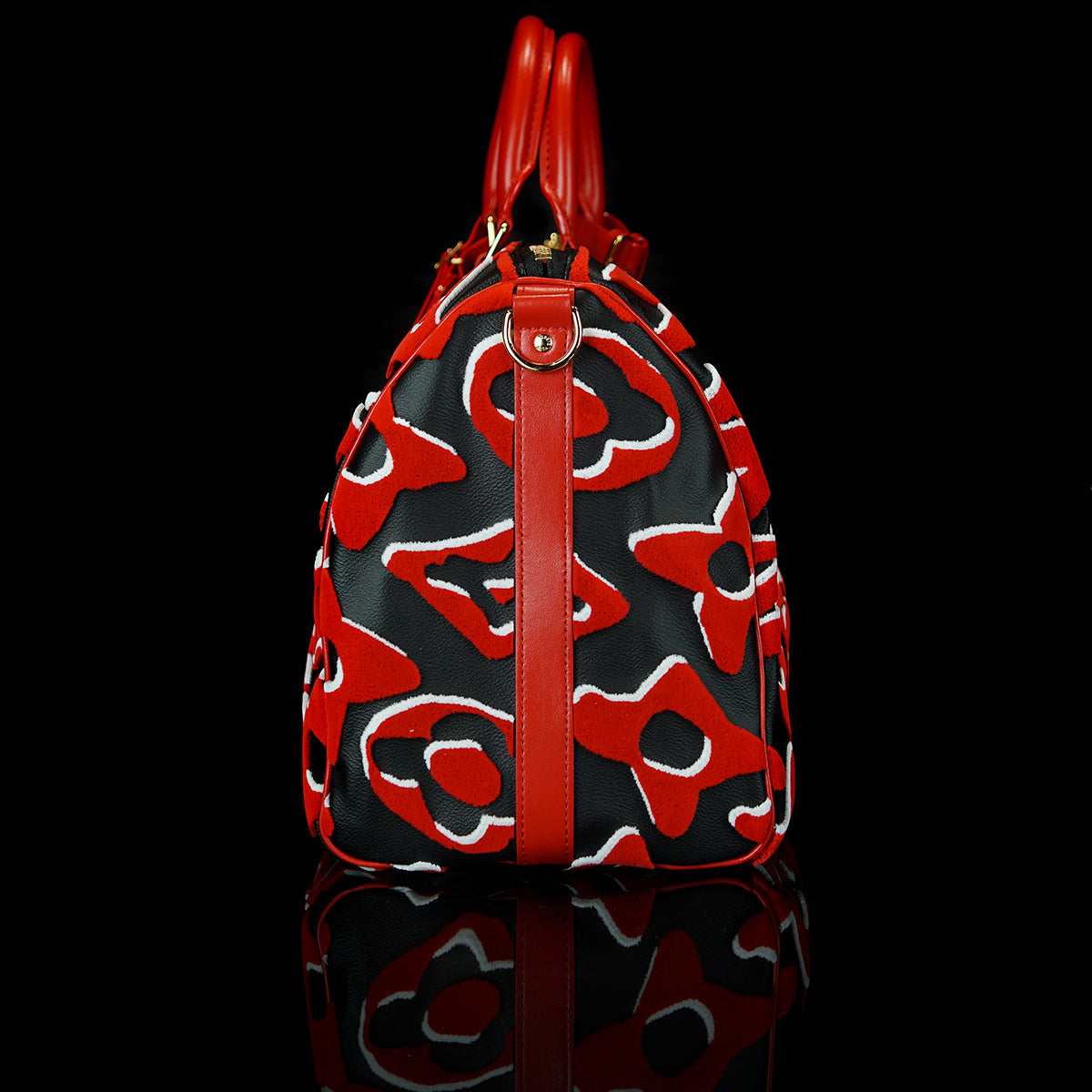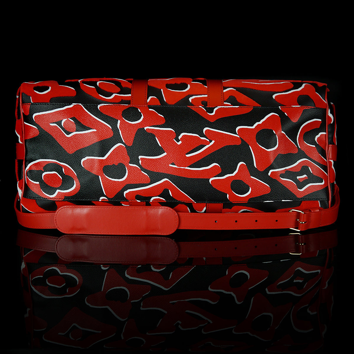 This bold version of the Bandoulière 45 Keepall bag is part of the special edition of seven bags proposed in the LV x UF Collection. The iconic weekender gets an arty vibe from the red and black Monogram motif, refashioned by Swiss artist Urs Fischer. The velvety, raised pattern gives the bag a unique tactile appeal. Collectors, take note.