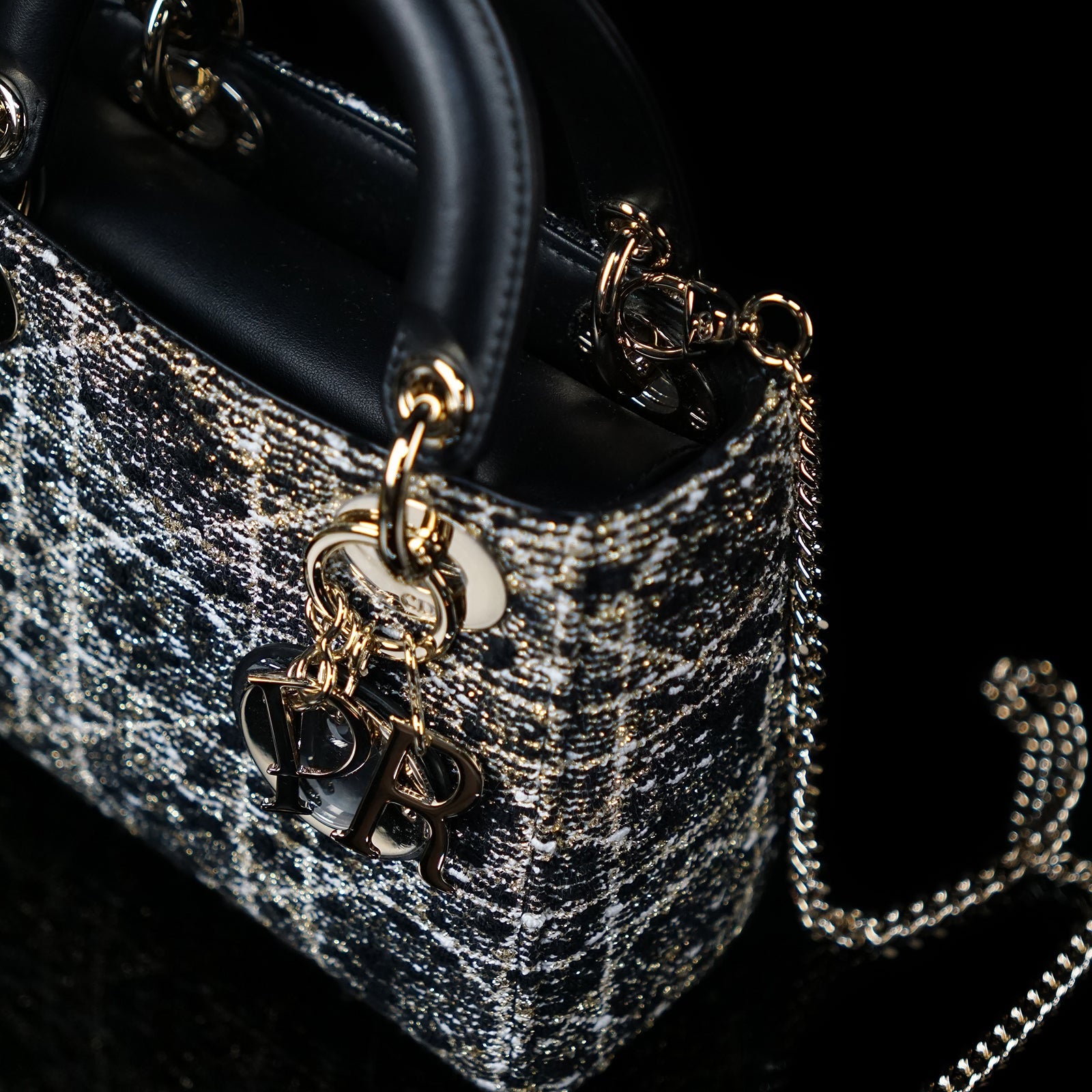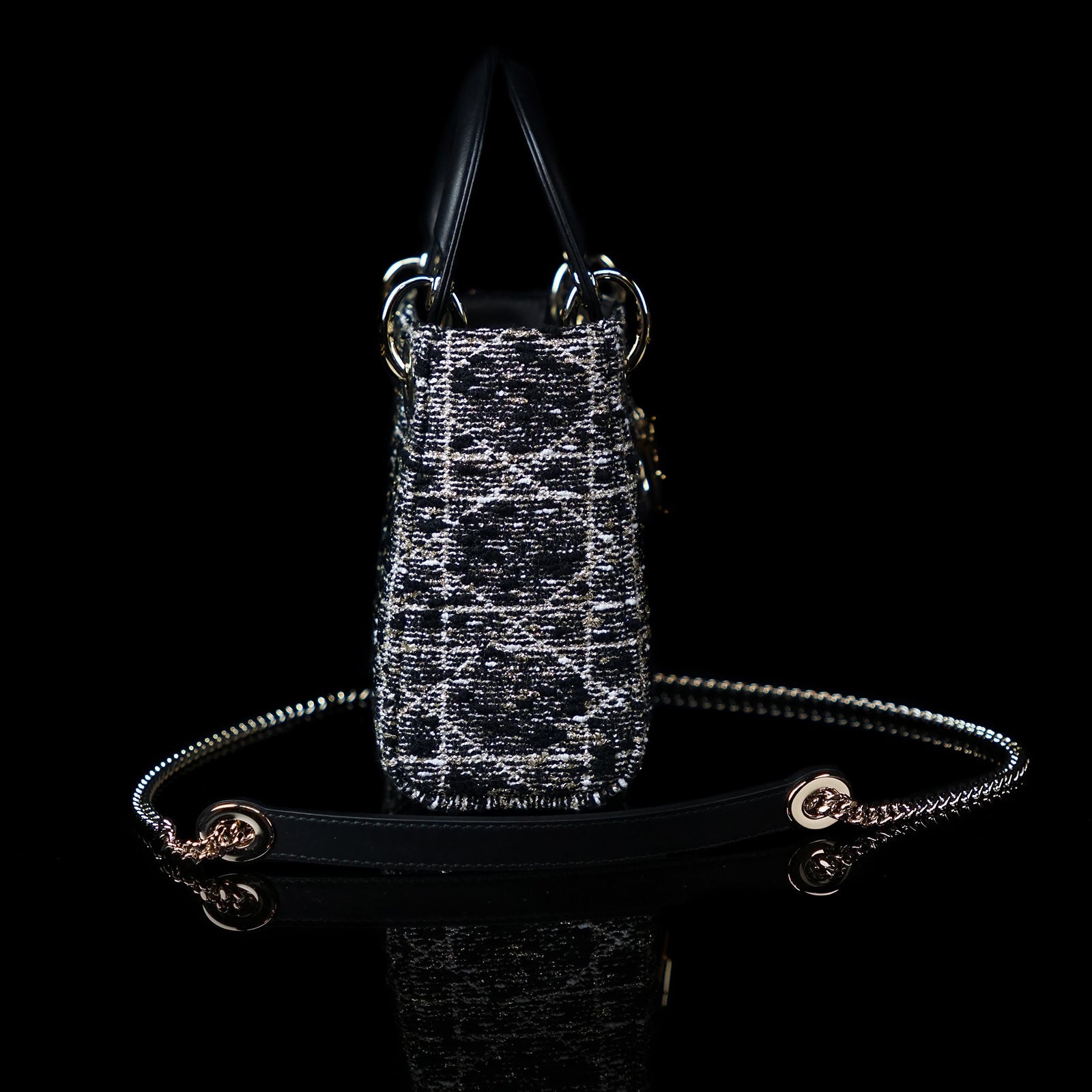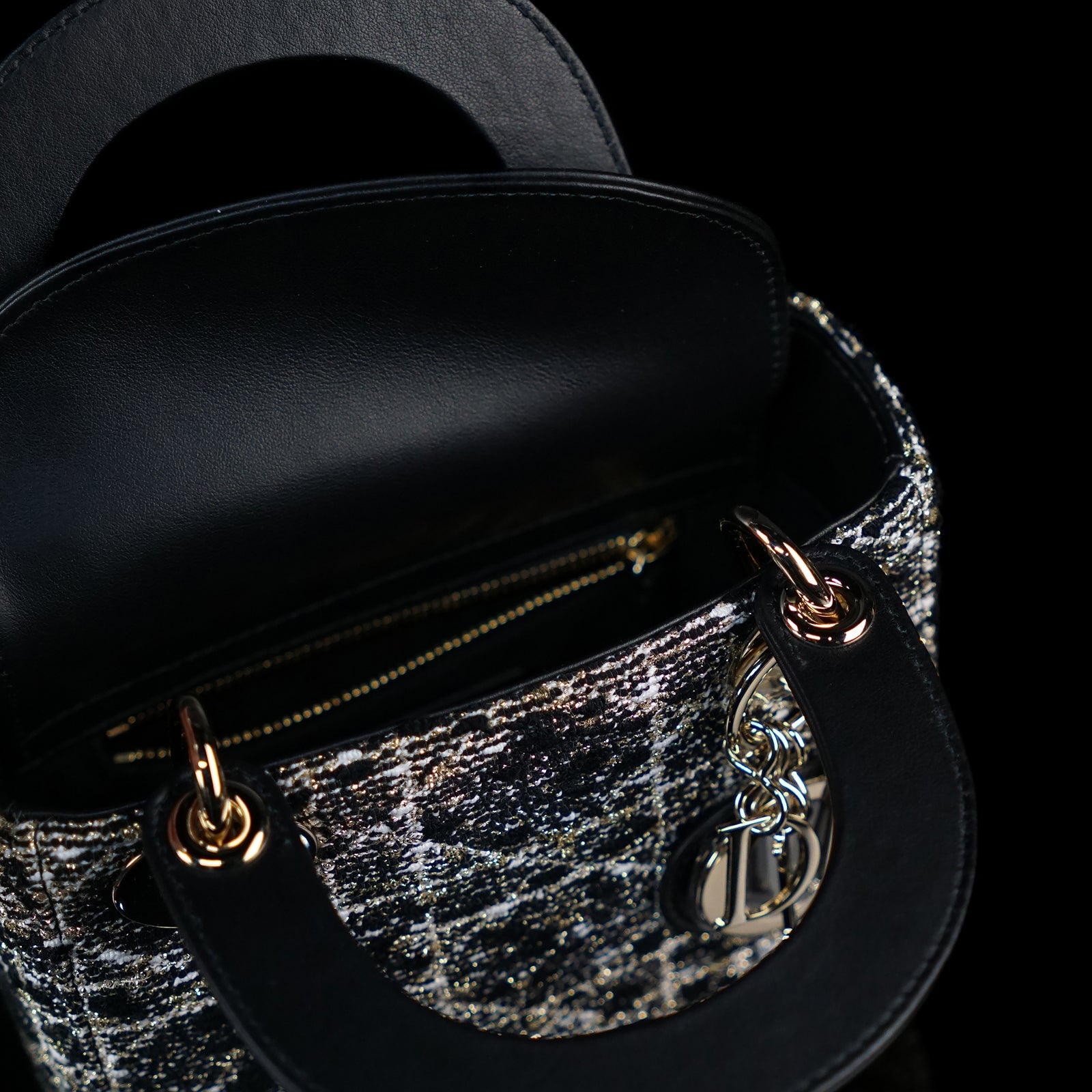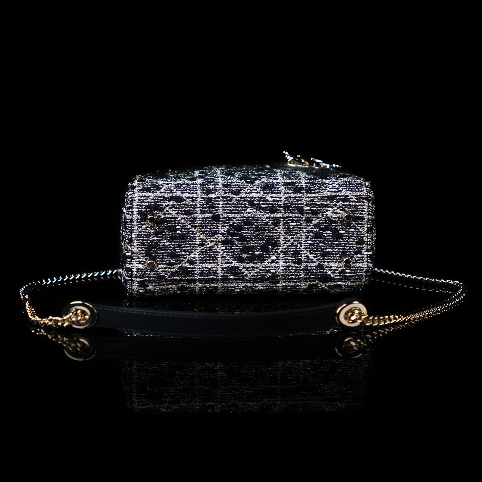 The Mini Lady Dior Bag is a testament to the House's dedication to elegance and craftsmanship. This exquisite accessory is meticulously crafted from black tweed, intricately woven with gold-tone metallic thread to create the iconic Cannage motif, offering a modern twist on a classic design. The bag is adorned with pale gold-finish metal 'D.I.O.R.' charms, adding a touch of refined sophistication.