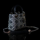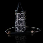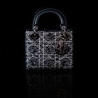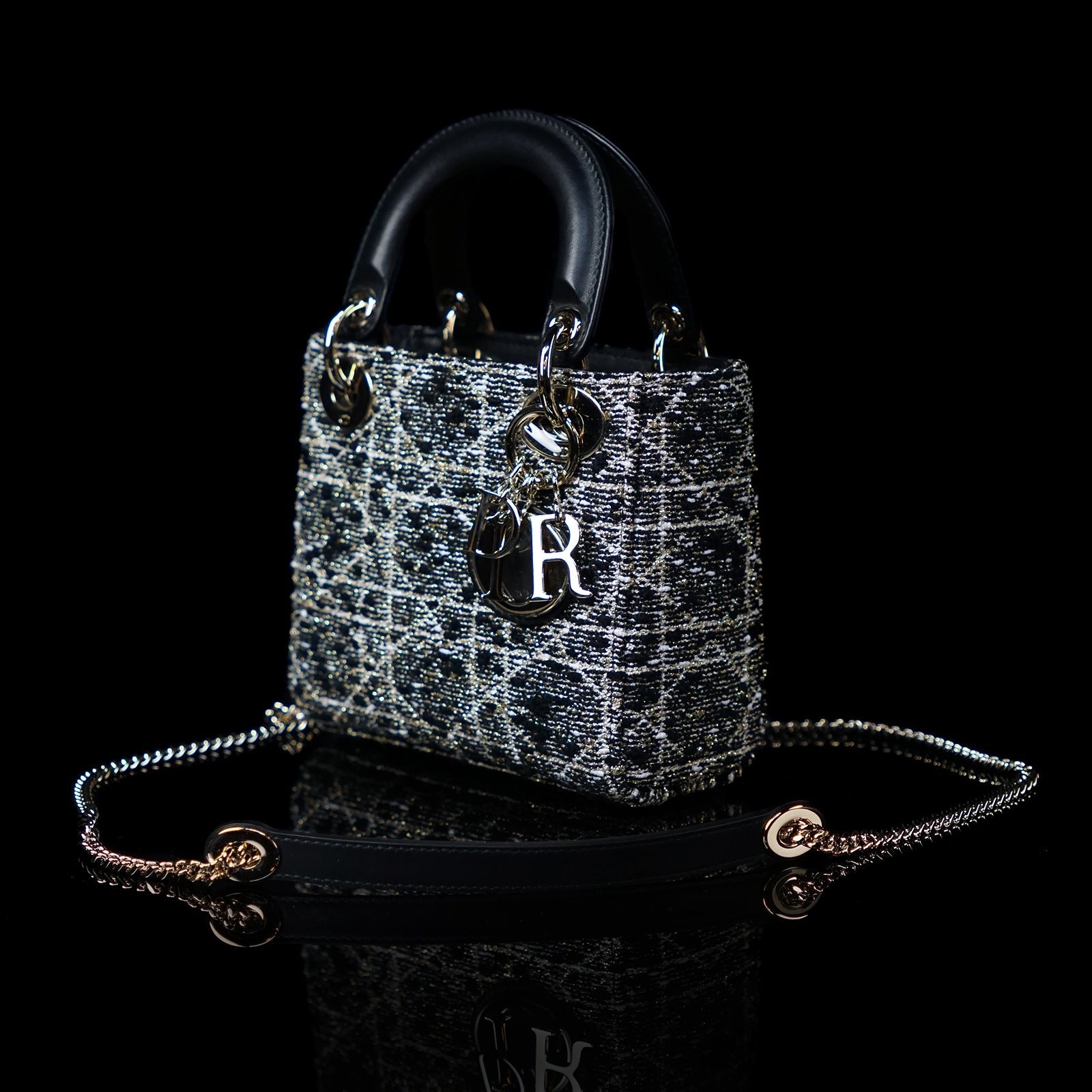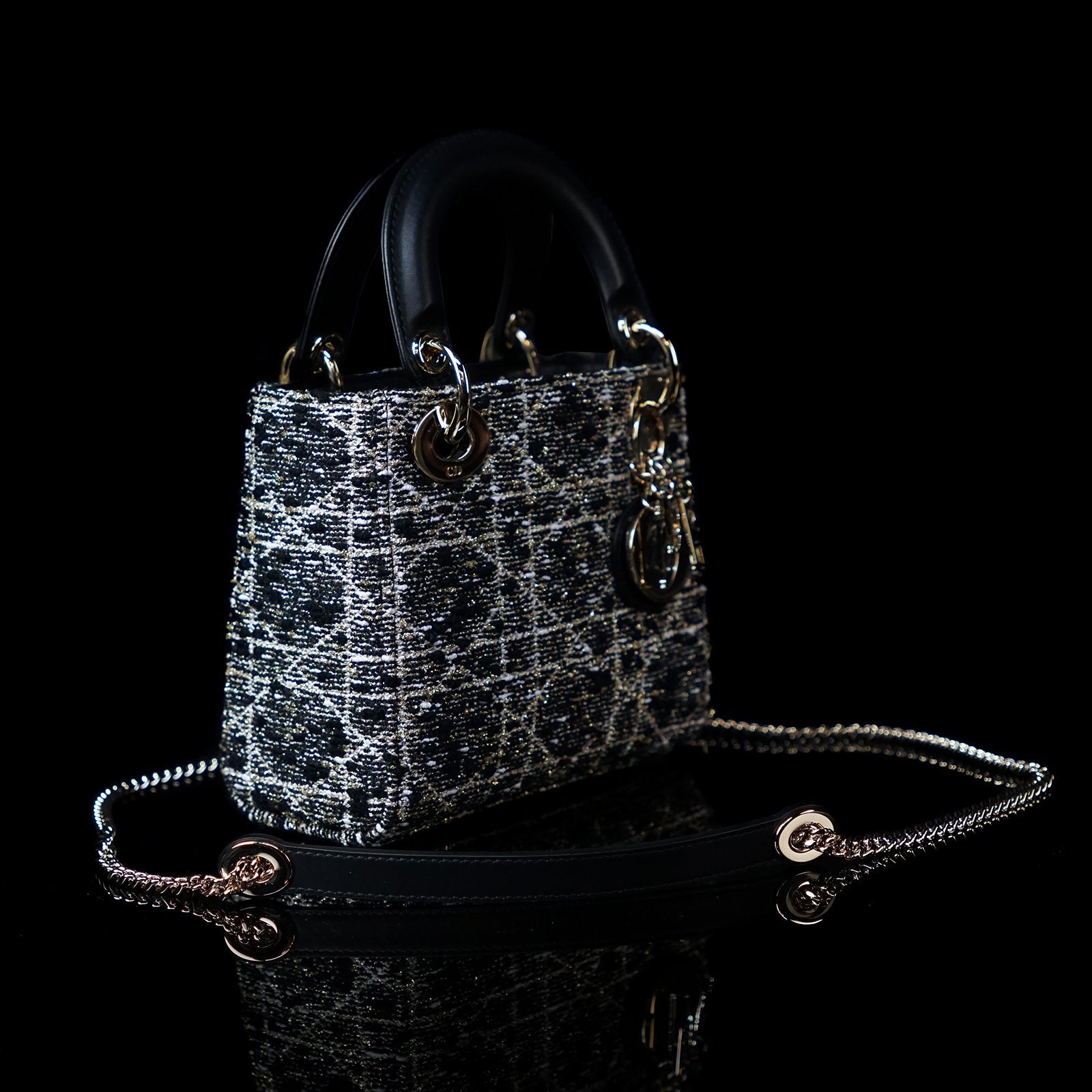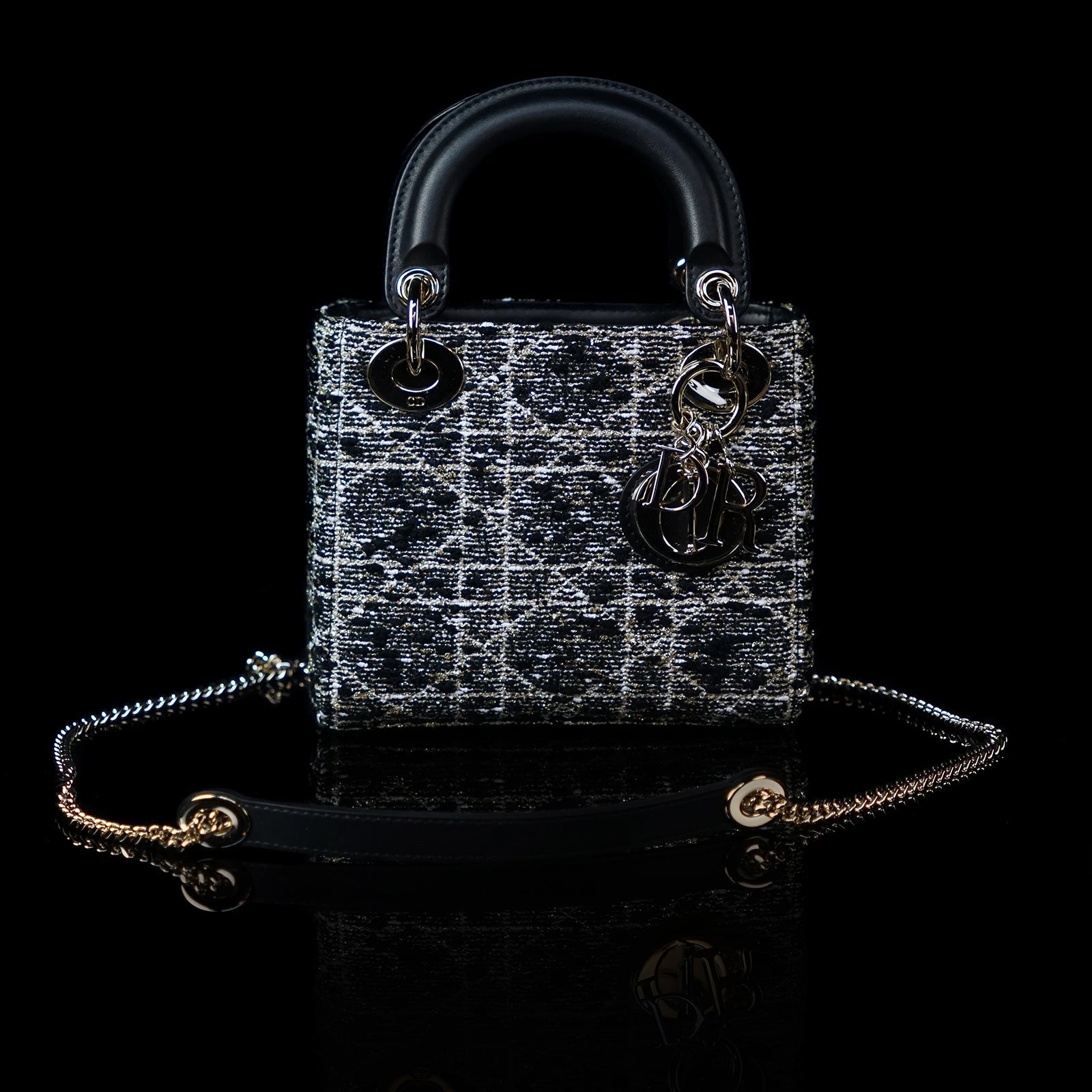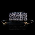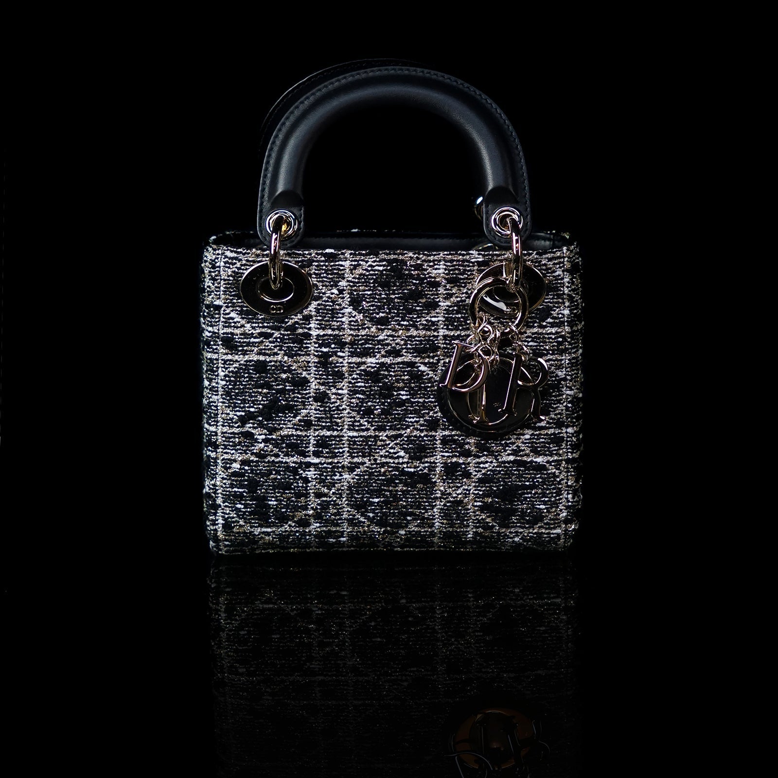 The Mini Lady Dior Bag is a testament to the House's dedication to elegance and craftsmanship. This exquisite accessory is meticulously crafted from black tweed, intricately woven with gold-tone metallic thread to create the iconic Cannage motif, offering a modern twist on a classic design. The bag is adorned with pale gold-finish metal 'D.I.O.R.' charms, adding a touch of refined sophistication.
