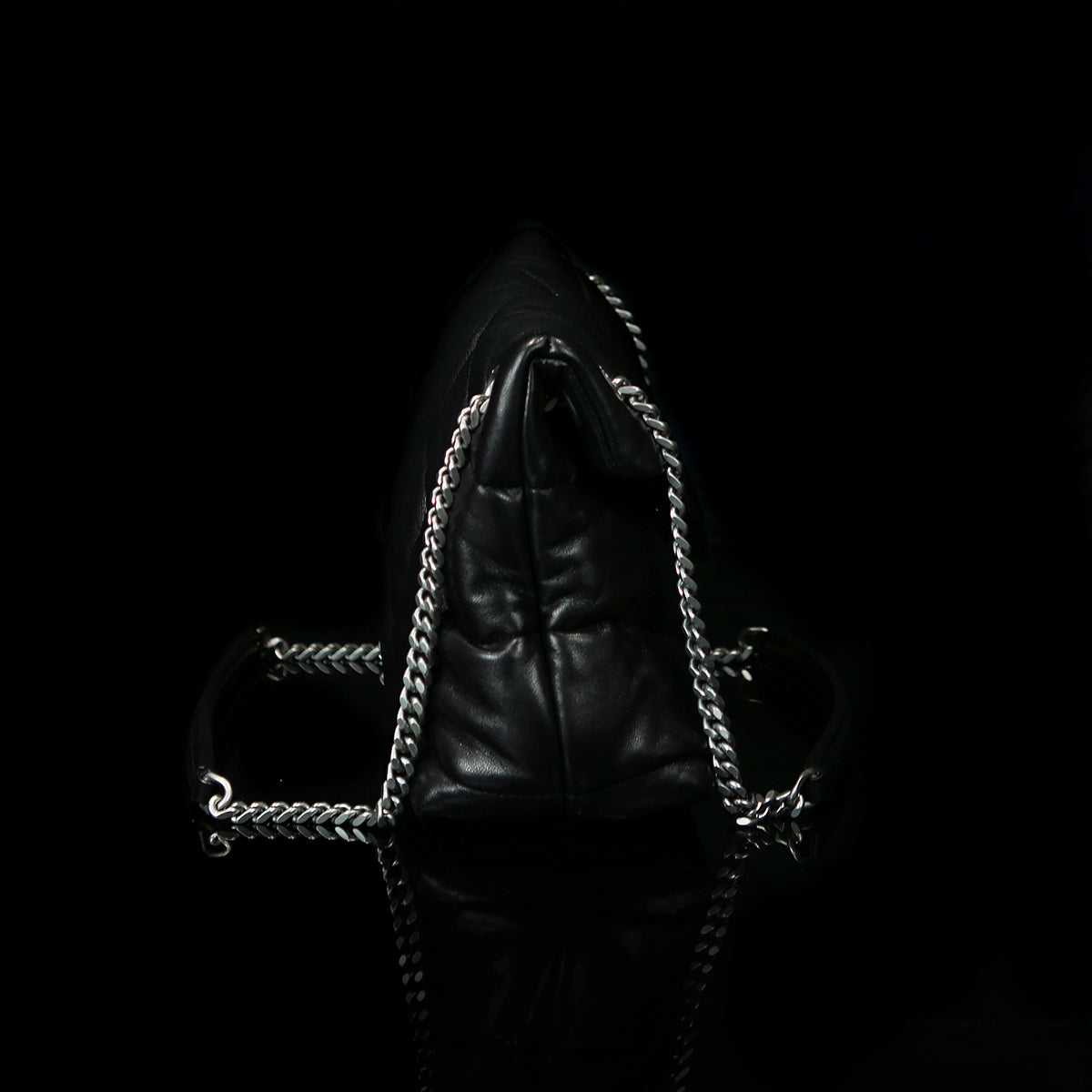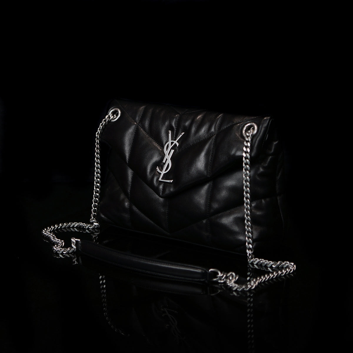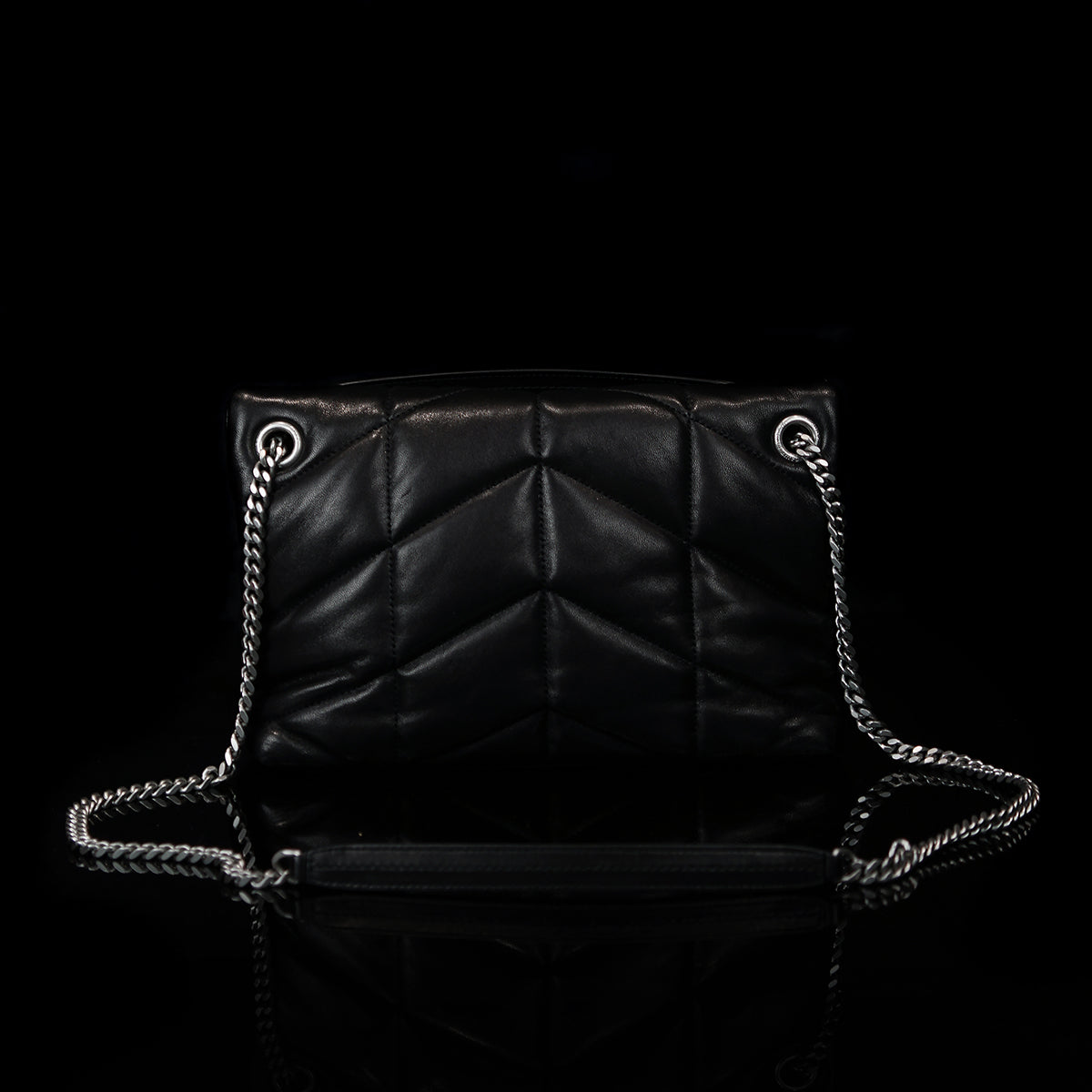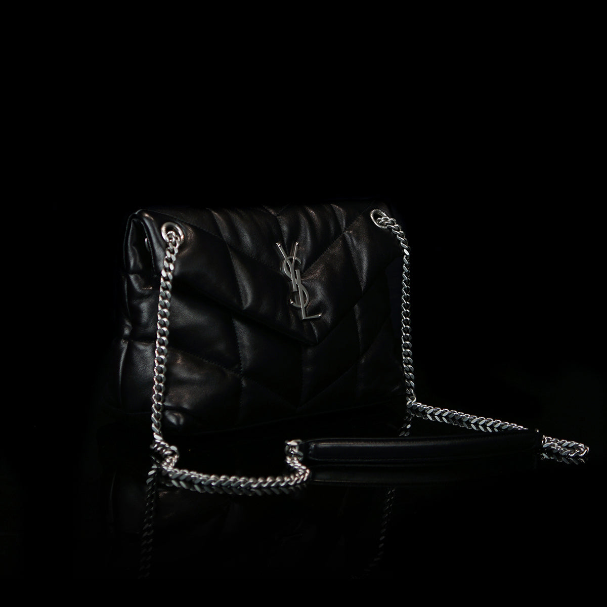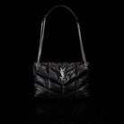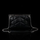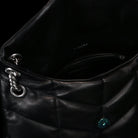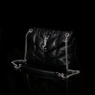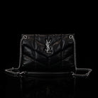 The Puffer Small Nappa bag by Saint Laurent is a sophisticated accessory made from luxurious lambskin, featuring grosgrain lining and nickel oxide hardware. It includes a magnetic snap tab closure, an interior zipped pocket, and an adjustable chain for versatile styling. Handcrafted in Italy, this bag effortlessly combines elegance and practicality for any occasion.