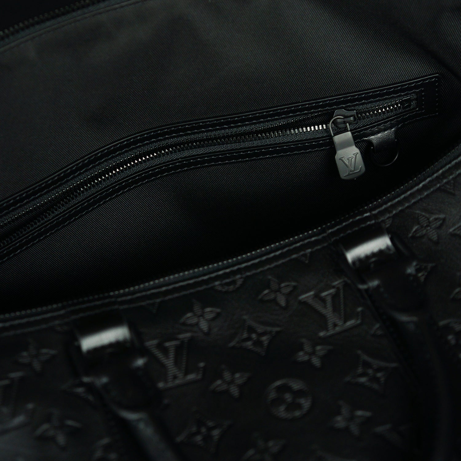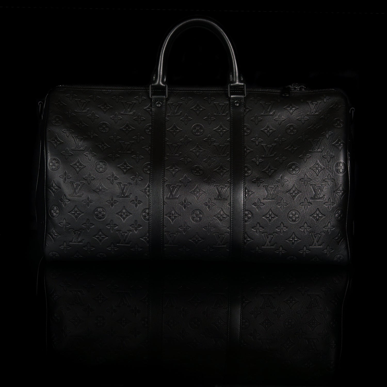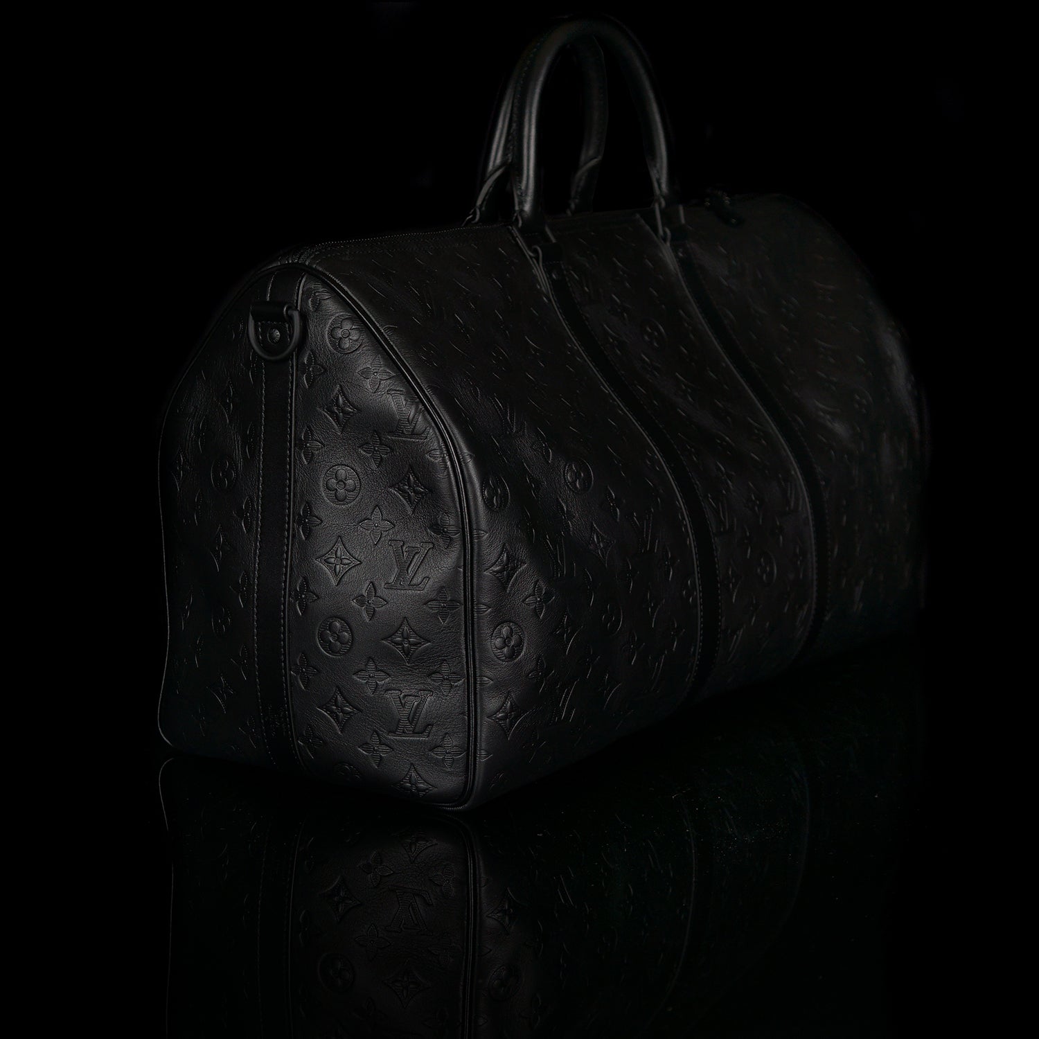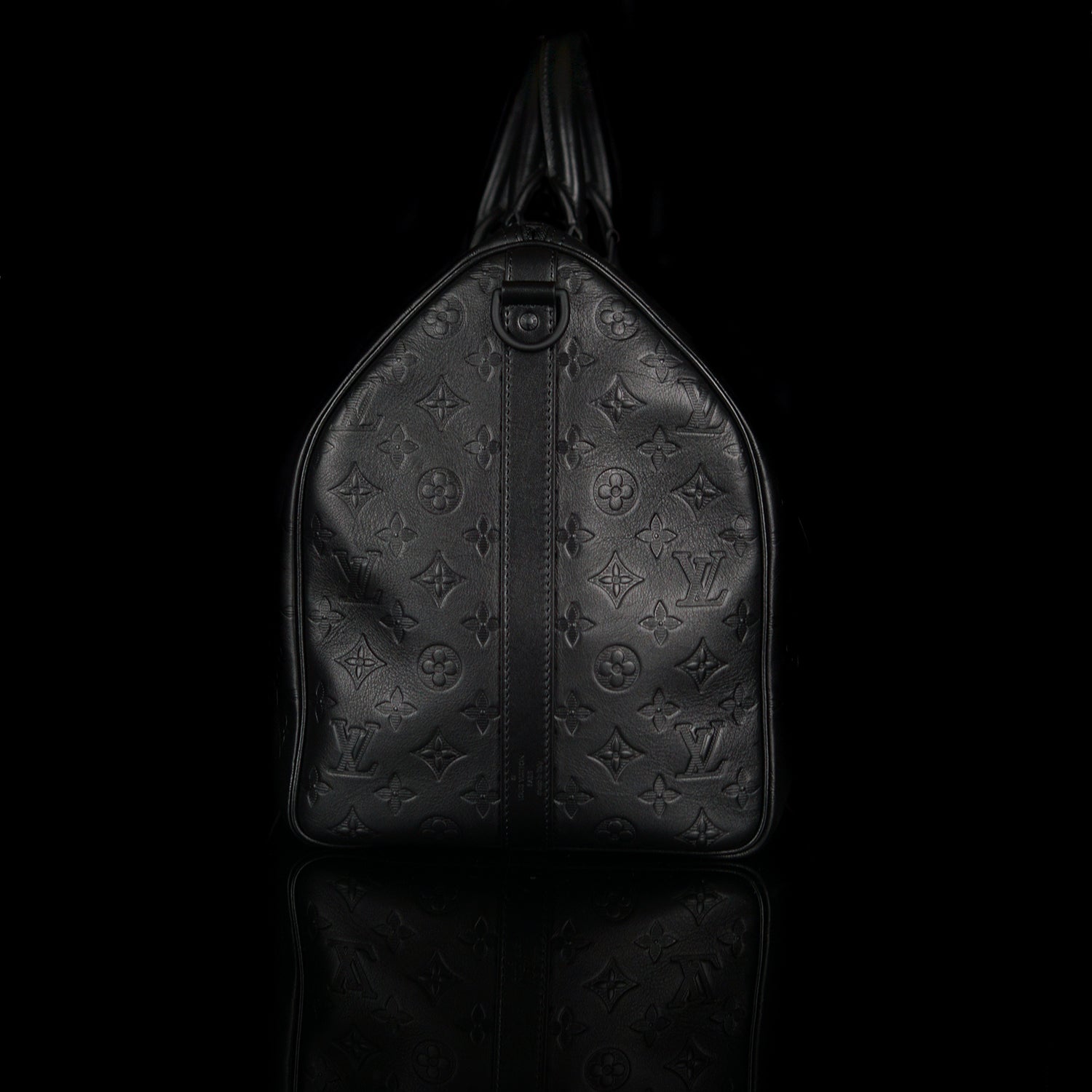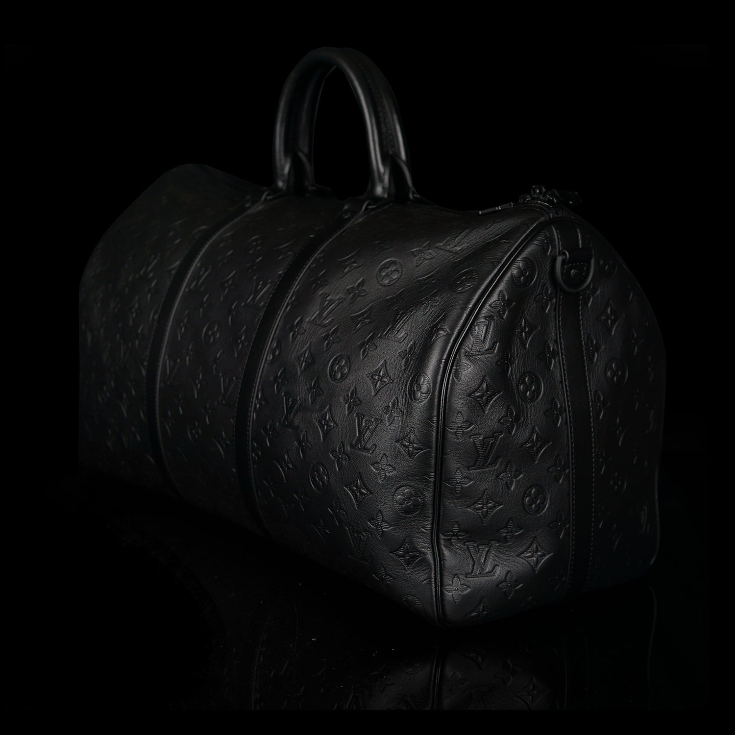 A Louis Vuitton icon, the Keepall Bandoulière 50 is revisited in Monogram Shadow leather, embossed all over with the Monogram pattern. The minimalist design is complemented by matte black hardware. Launched in the 1930s, the Keepall was the original soft travel bag and remains as elegant as ever, with the cabin size ideal for short trips.