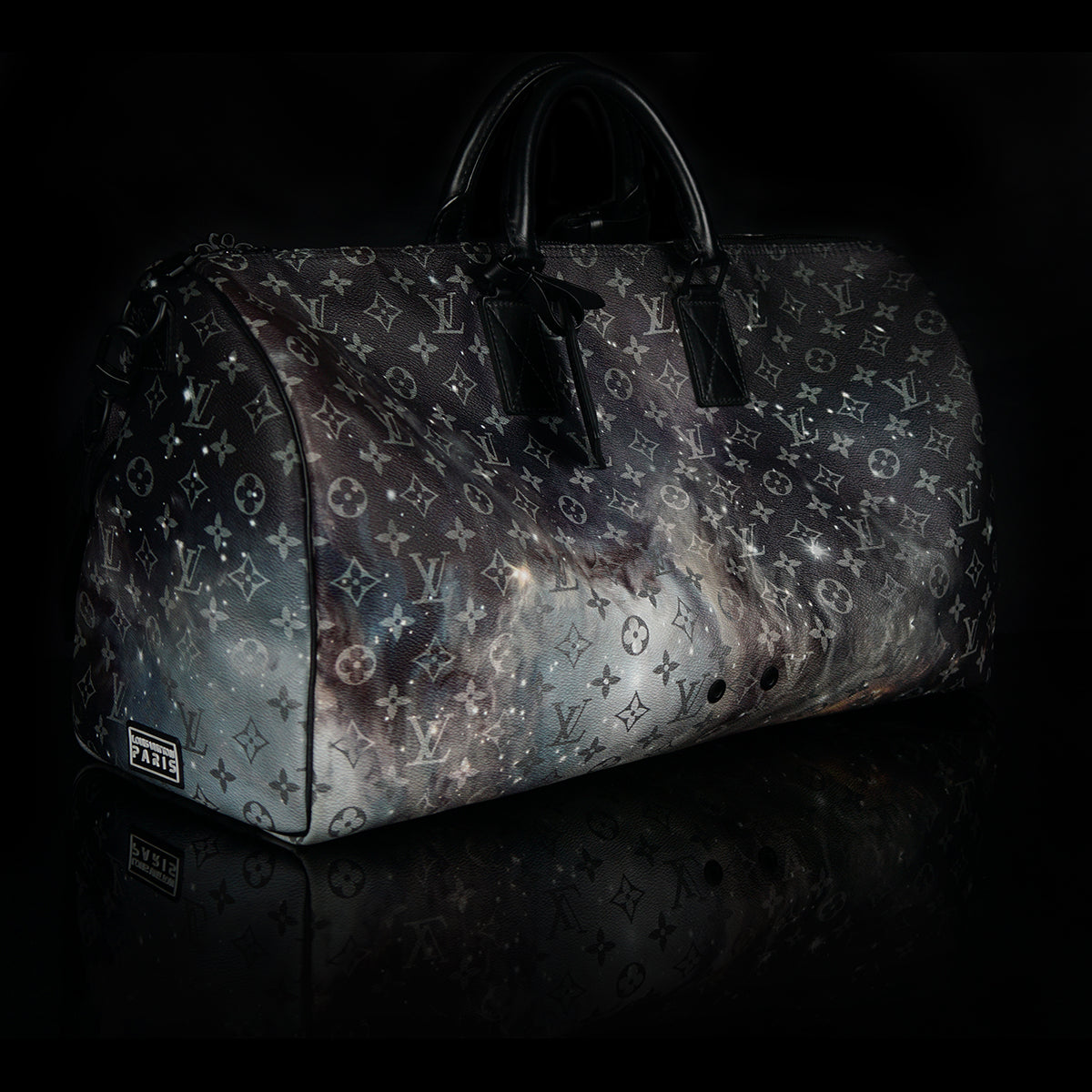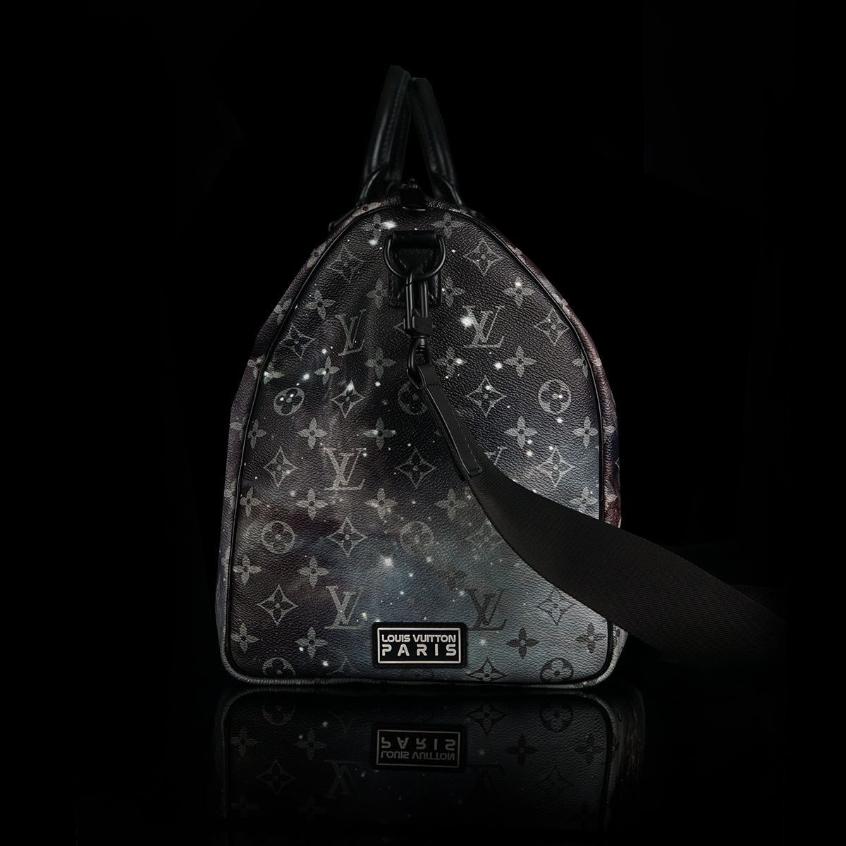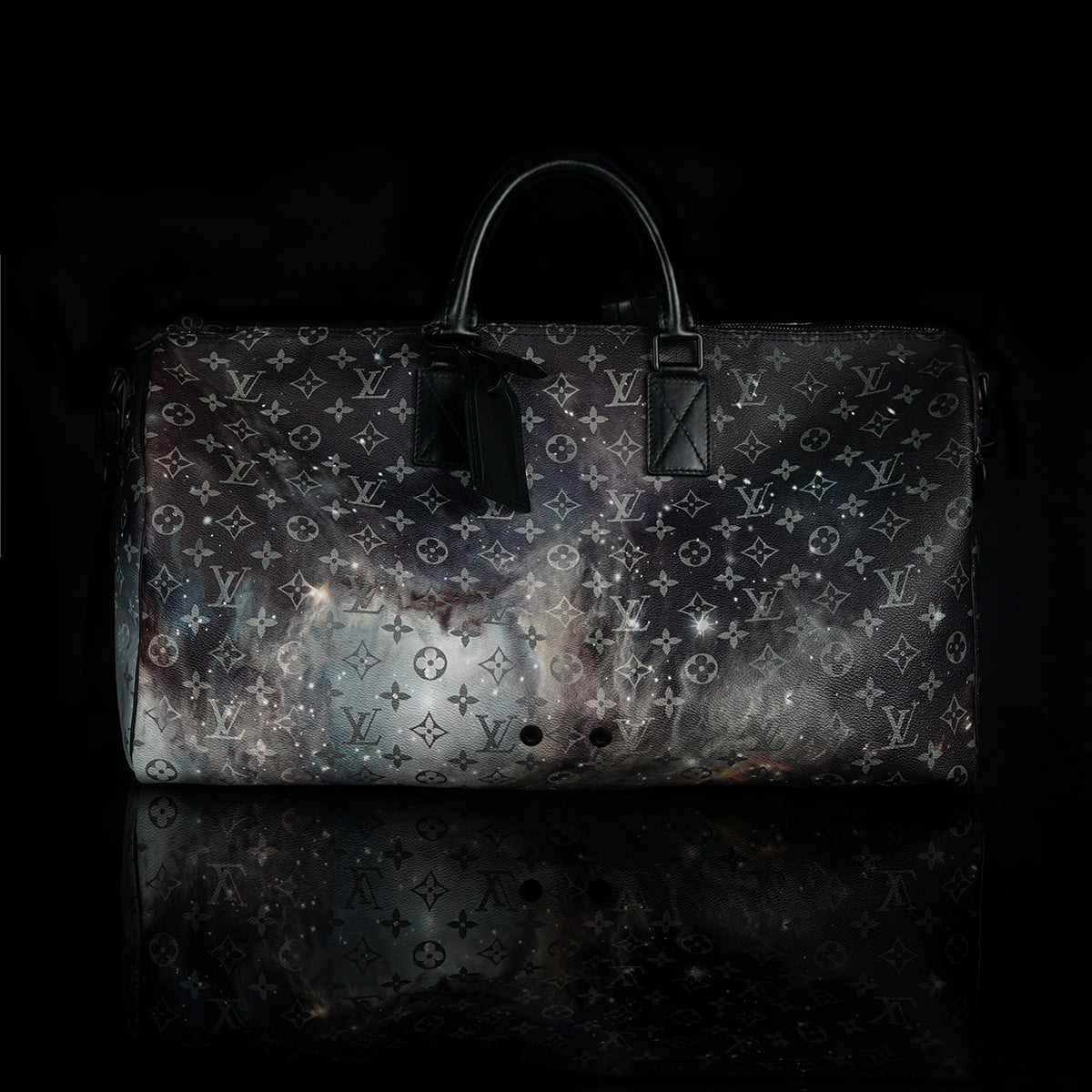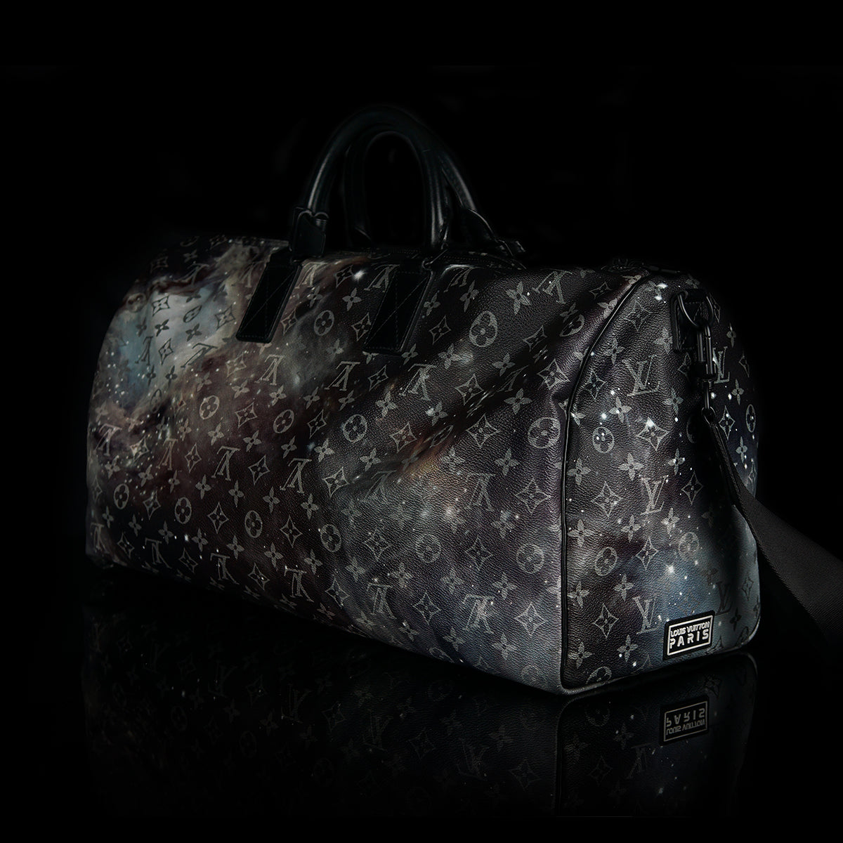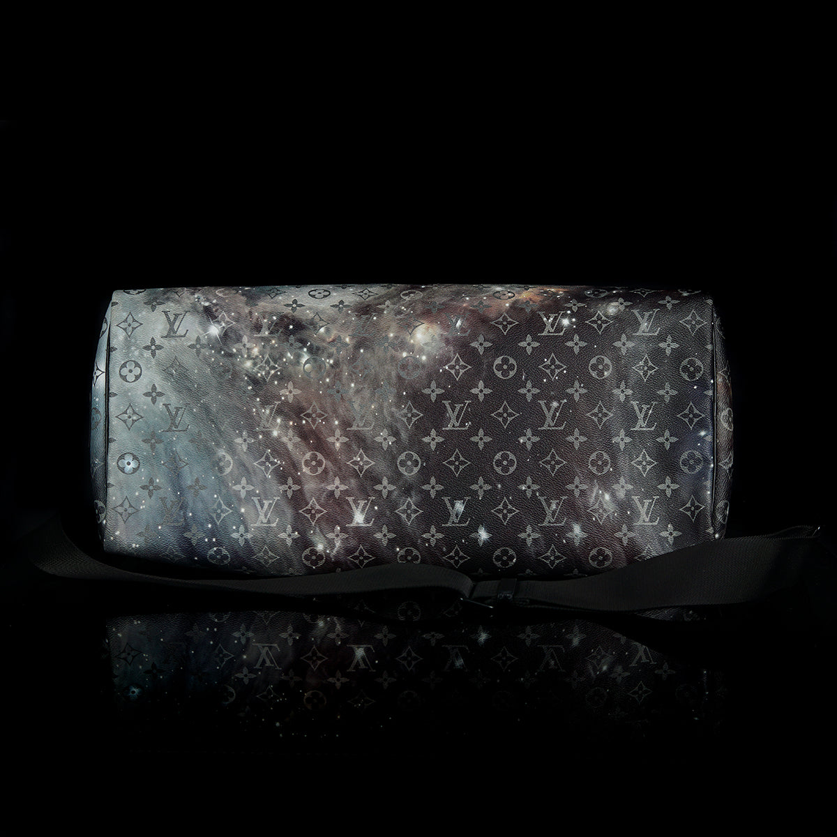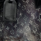 The Keepall Bandouliere Monogram Galaxy 50 by Louis Vuitton is a stylish travel bag featuring a striking monogram galaxy pattern. Crafted with cow-leather trim and black hardware, it includes a zipped inside pocket, offering a large capacity ideal for travel. The bag is cabin size, and comes with a removable and adjustable strap, as well as double handles for versatile carrying options. This luxurious accessory combines practicality with an eye-catching design.